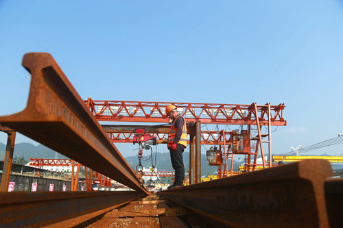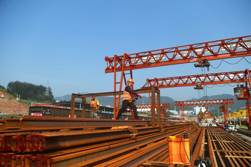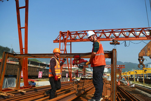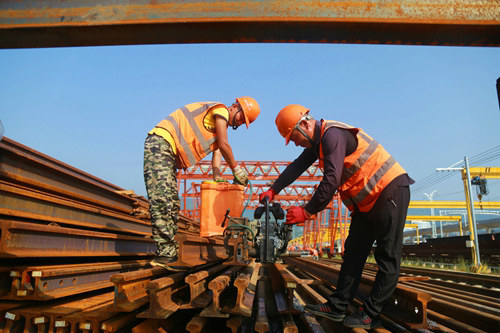 工人們對調(diào)整好位置的鋼軌輕松進(jìn)行鉆孔作業(yè)