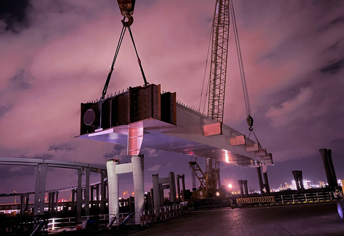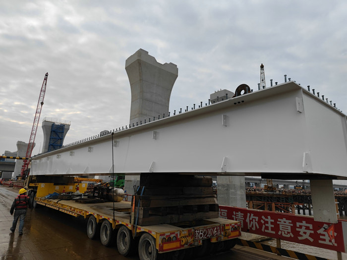 濱?;ネㄖ骶€全長2390米、8座匝道橋5995米的、4座拼寬橋1320米,設(shè)634個(gè)墩柱、67聯(lián)441片鋼混組合梁,使用鋼材31593.7噸、混凝土29418.9立方。鋼箱梁由寧波舟山一廠家生產(chǎn)。去年12月通過海上運(yùn)輸、碼頭卸裝和轉(zhuǎn)運(yùn),將鋼箱梁運(yùn)至現(xiàn)場,29日上午架設(shè)第一片梁,3天架設(shè)3跨6片,受海風(fēng)、臺風(fēng)等影響,直到今年6月8日到15日進(jìn)行第二波架梁,完成12跨24片架梁任務(wù),前兩波共架設(shè)30片梁。