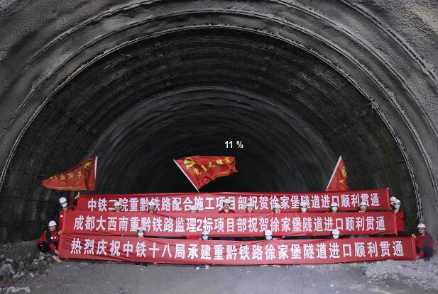 中鐵十八局集團重黔高鐵6標徐家堡隧道進口較原計劃提前185天順利貫通( 田緣圓 攝 )