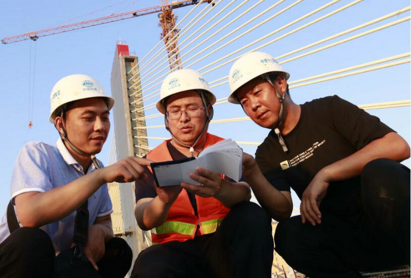 3、中鐵十八局集團(tuán)五公司建筑公司經(jīng)理畢樹兵(中)、項(xiàng)目書記劉建民(右)與技術(shù)員在現(xiàn)場(chǎng)研究方案(伍振 龍艷 攝)