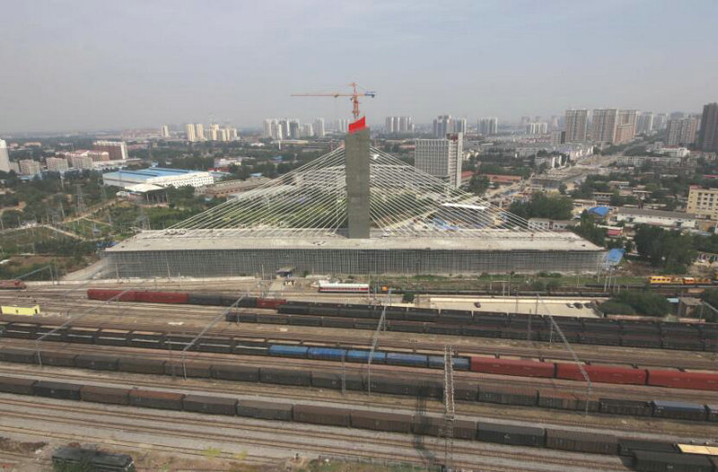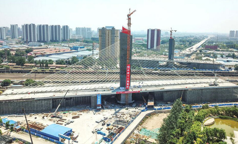 2、中鐵十八局集團(tuán)參建的保定樂凱大街南延工程轉(zhuǎn)體斜拉橋跨越京廣鐵路大動(dòng)脈等21條鐵路線(伍振 龍艷 攝)