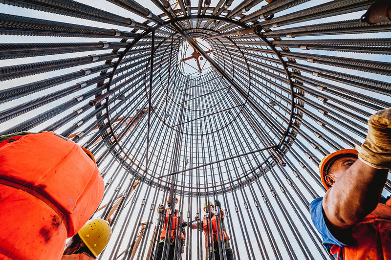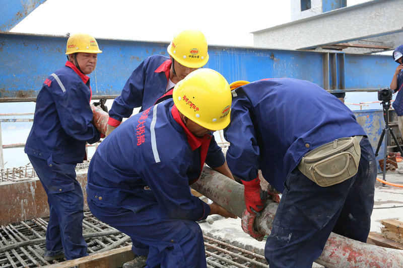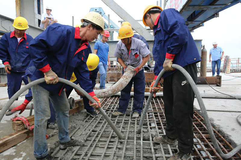 “鐵建砼01”攪拌船通過兩個(gè)42米長的輸送泵將混凝土輸送到鋼筋模板內(nèi)部