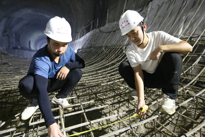 李敏(右)與技術(shù)員吳亞明在白秀山2#隧道檢查仰拱鋼筋間距隧道里架橋,是貴南高鐵施工的一大奇觀,體現(xiàn)了中國(guó)鐵建員工高超的智慧和靈感。在世界上享有基建狂魔的中國(guó),絕不是吹牛,而是靠實(shí)干干出來的。