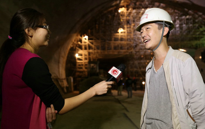 圖為李敏接受貴州衛(wèi)視記者采訪三工區(qū)管段為白秀山1#隧道出口、弄力大橋、白秀山2#隧道。其中,白秀山1#隧道全長(zhǎng)3300米,二工區(qū)負(fù)責(zé)進(jìn)口1700米,三工區(qū)負(fù)責(zé)出口段1600米,長(zhǎng)210米的弄力大橋,設(shè)計(jì)為6跨,夾在兩座隧道之間,白秀山2#隧道全長(zhǎng)2500米。