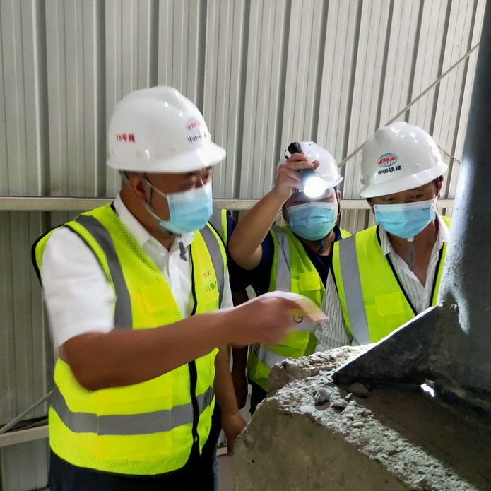 曹元均(左1)在拌合站指出安全存在細節(jié)問題