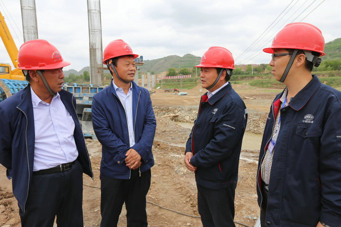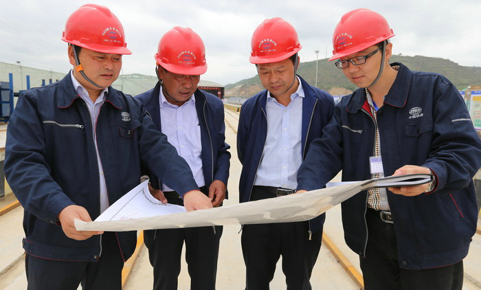許寶勇(左一)與項(xiàng)目經(jīng)理張驊(右二)、書(shū)記李文才(左二)、總工崔正大(右一)查看圖紙