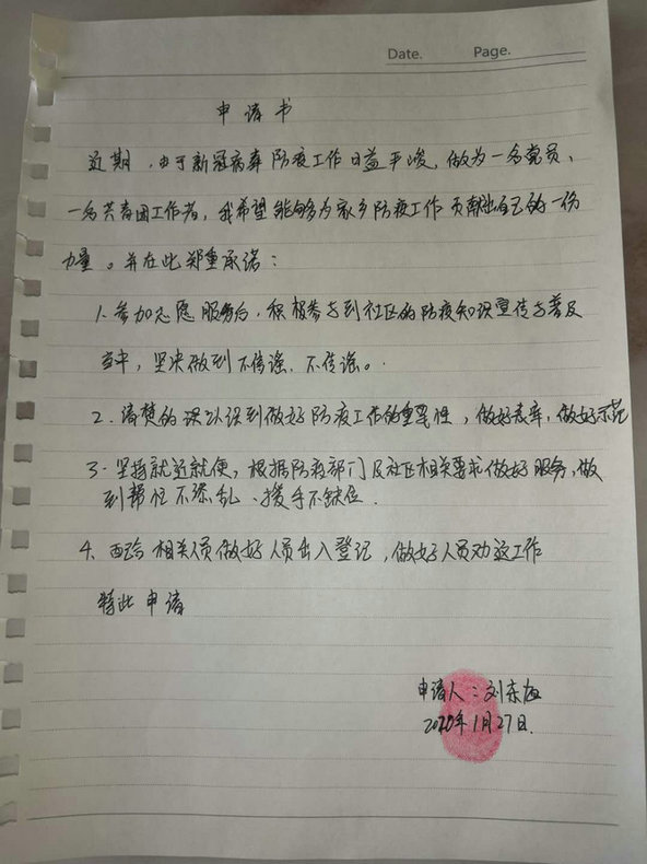 在疫情防控正值關(guān)鍵時期他接到地方社區(qū)通知,異地返鄉(xiāng)人員需要前往社區(qū)進行報備工作,在報備結(jié)束后他積極的向所住社區(qū)遞交了“志愿服務(wù)請愿書”,如果家鄉(xiāng)有需要,隔離結(jié)束后便可以及時投入到社區(qū)防疫志愿服務(wù)工作當中去。并以黨員名義向地方黨組織作出承諾,帶頭做到不信謠、不造謠、不傳謠,積極通過微信群、朋友圈、電話等方式引導(dǎo)身邊親友配合社區(qū)做好疫情篩查檢測工作,勸導(dǎo)親屬及朋友在疫情防控期間不串門、不集會、不聚餐。持續(xù)強化宣傳力度,引導(dǎo)身邊的人相信科學(xué)、增強信心。