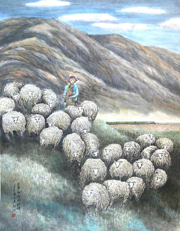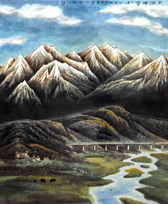 懷著崇敬之情,創(chuàng)作很快深入進(jìn)行。我的一幅反應(yīng)青藏鐵路建設(shè)的中國畫不僅入選了第十三屆大路畫展,還獲得了優(yōu)秀獎(jiǎng),當(dāng)我站在中國美術(shù)館展廳,看到自己的作品登上大雅之堂時(shí),成功的喜悅洋溢于外表。
