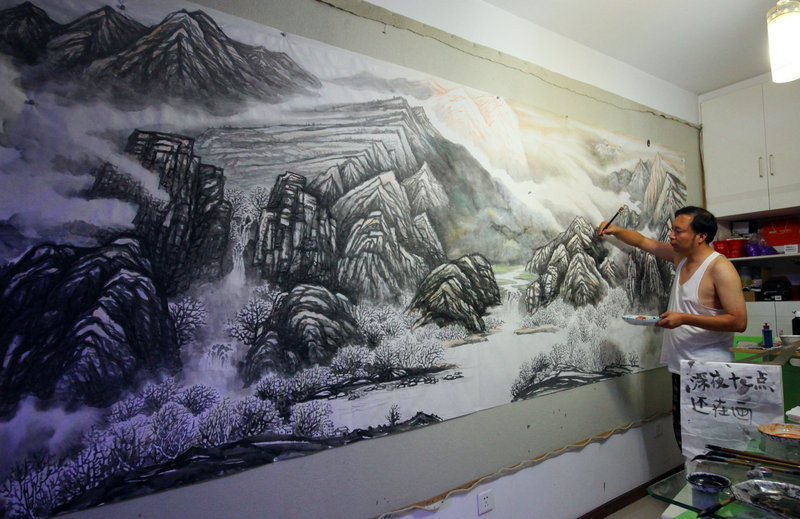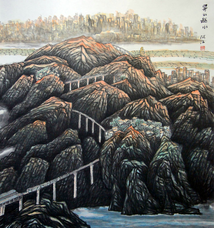 中國的高鐵建設(shè)方興未艾,高鐵建設(shè)者正奔波于祖國的四面八方,就拿我們公司來講,短短幾年的時(shí)間里,先后參建了鄭西、石武、滬昆、哈齊、湘桂、貴廣、南廣、廈深等十多條高速鐵路建設(shè)。伴隨高鐵施工的大發(fā)展,表現(xiàn)高速鐵路建設(shè)的宏偉畫卷也在每一位大路畫家的心中開始琢磨起來。2010年秋天,石武高速鐵路施工迎來施工大干高潮,我和單位同事一道,離開公司機(jī)關(guān),輾轉(zhuǎn)千里,來到湖北與河南交界的大悟縣,施工大干之際,我一邊工作,一邊用隨身的小本畫工地速寫,工余時(shí)間就在宿舍畫工地小景,在工地上雖然畫畫的條件不太寬裕,單弄一塊土工布代替羊毛氈,放在桌子上依然能夠解決畫國畫的基本需求,就這樣,幾個(gè)月下來,居然還有不少收獲,一幅幅再現(xiàn)高速鐵路建設(shè)的山水畫躍然紙上,其中一幅畫還被《中國鐵道建筑報(bào)》評為了年度優(yōu)秀美術(shù)作品獎(jiǎng)。