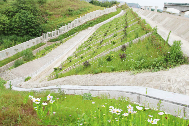 花團錦簇的路基護坡一角 橋墩作業(yè)完成后及時植綠種草,做到黃土不漏天