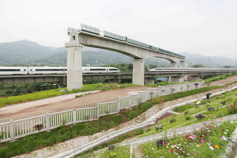 近日,筆者走進正在建設中的中鐵十五局集團重慶鐵路樞紐東環(huán)線DHZQ-1標項目工地,放眼望去,滿眼綠色,綠色的路基護坡、綠色的防護柵欄、綠色的山體防護。聳立在鮮花綠草之上,與既有鐵路相向而行,整齊排列的光潔亮麗的橋墩等等,新建鐵路與既有渝貴高鐵線路只有十幾米之遙,但乘上既有線的高鐵列車,你也同樣會有“人在車上坐、車在畫中行”的美好感受與暢想……