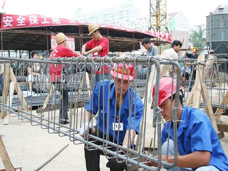 結(jié)合,才使我國經(jīng)濟(jì)走上了快速發(fā)展之路,也是“尊重勞動、尊重知識、尊重人才、尊重創(chuàng)造”的精神所在和實(shí)質(zhì)表現(xiàn)。如今就有不少農(nóng)民工自豪地說:“只要掌握技術(shù),有絕活兒,就不愁沒活兒干。”在我們項(xiàng)目上有位叫彭兆陽的農(nóng)民工師傅說:“我從十七歲開始學(xué)習(xí)電工電焊,開鉆機(jī)和機(jī)械修理,快二十年了,一個(gè)月掙四五千元很正常,干得好老板還會漲點(diǎn)工資,年底另有獎金。”下面是筆者無意間從佛山市華陽特大橋建設(shè)工地上,用數(shù)碼相機(jī)拍攝到的農(nóng)民工工作照,你能說這些農(nóng)民工兄弟不是人才嗎?