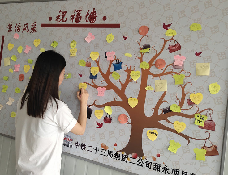 “祝中鐵二十三局集團蒸蒸日上,祝甜永項目越來越好,祝父母孩子健康快樂,祝同事工作順利、平安幸福,祝好人一生平安,祝我有個瘋狂快樂的假期游,希望我快快變瘦!生活再難也要記得微笑面對哦……”這是中鐵二十三局二公司甜永項目部員工風(fēng)采寄語墻上的員工留言。每每員工排隊打飯期間,會不約而同將視覺鎖定在祝福語展板上。仔細看五顏六色、形狀各異的可愛粘貼紙像豐盛果實掛滿大樹。這些承載員工大到對企業(yè)的祝福,小到對自己生活的許愿,把項目團隊的正能量,員工對遠離家鄉(xiāng)溫情的惦念、大家充滿激情的青春夢想體現(xiàn)的淋漓盡致,表現(xiàn)出項目大家庭里每個成員都有積極向上、陽光進取的心態(tài)。