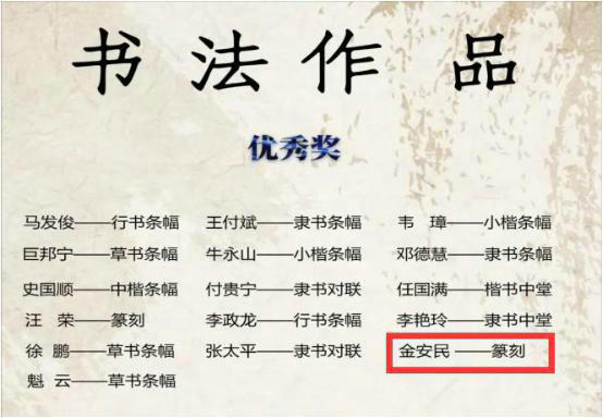 近日,“中國夢·勞動美--喜迎二十大 建功新時代”青海省職工群眾書法國畫攝影展作品征集評選活動評選結(jié)果揭曉,中鐵二十一局四公司職工金安民篆刻作品喜獲書法作品優(yōu)秀獎。本次評選共征集書法作品325幅,經(jīng)評委會評審,最終83幅書法作品入展。
