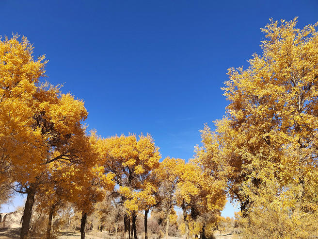 沙雅縣的胡楊林,坐落之處,有沙有水,散落在賴以生存的塔里木河兩岸。一半在土里安詳,一半在風(fēng)里飛揚,一半澆灌陰涼,一半沐浴陽光。從空中看,它像一個個蘑菇散落在大地,又像一朵朵云彩來到人間,深秋時節(jié)展現(xiàn)在眼前的是一片金色的海洋。誠如詩人所言,“極目金黃千里秀,自成一景閱滄桑”,這宏偉壯觀的色彩盛宴使人震撼不已,令人流連忘返。