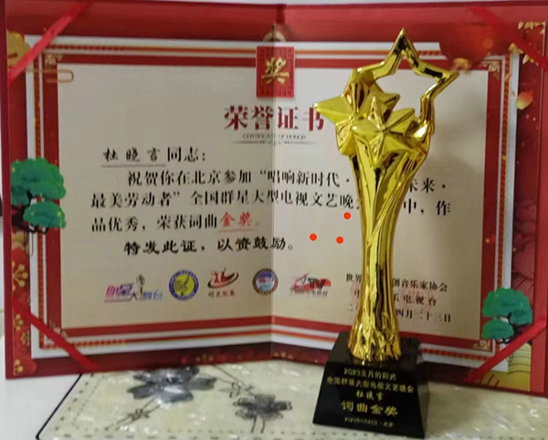 2023年4月23日,在中國音樂電視臺主辦的“唱響新時代 展望新未來 最美勞動者”全國群星電視文藝晚會活動中,由杜曉言作詞、蒙古族著名作曲家哈斯雅托嘎作曲、新疆建設兵團著名歌唱家雅麗演唱的《祖國,我為你自豪》榮獲金獎。近期在《海南衛(wèi)視》、騰訊音樂、酷狗音樂等音樂媒體熱播。