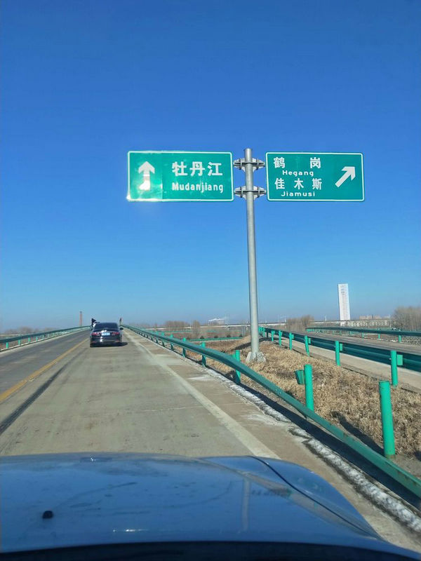 在返回路過佳木斯市區(qū)的高速公路上,我用手機抓拍的一處三個地名的路標指示牌,即佳木斯、牡丹江和鶴崗市,這三個城市的名字剛映入我的眼簾,我的心情宛如打翻的五味瓶,情不自禁的流下兩行眼淚。