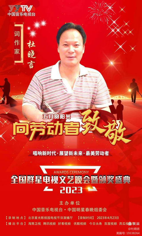 杜曉言,騰訊音樂(lè)人,軍旅詞作家,新聞撰稿人,中國(guó)音樂(lè)著作權(quán)協(xié)會(huì)會(huì)員,中國(guó)音樂(lè)文學(xué)學(xué)會(huì)會(huì)員,中國(guó)職工攝影家協(xié)會(huì)會(huì)員,中國(guó)職工音樂(lè)家協(xié)會(huì)會(huì)員,《鐵路工程建設(shè)網(wǎng)》通訊員,1962年11月山東鄆城生人,現(xiàn)定居濟(jì)寧市。1981年10月參加鐵道兵,1984年1月隨鐵道兵集體兵轉(zhuǎn)工。迄今在《中央電視臺(tái)》《內(nèi)蒙古衛(wèi)視》《海南衛(wèi)視》《山西衛(wèi)視》《安徽衛(wèi)視》《河南衛(wèi)視》《中國(guó)國(guó)際廣播網(wǎng)》《廣西廣播網(wǎng)》《QQ音樂(lè)》等演唱作詞歌曲100多首。在《詞刊》《歌曲》《廣播歌選》《解放軍歌曲》《重慶音樂(lè)》《上海歌聲》等發(fā)表歌詞500多首,創(chuàng)作歌詞3000多首。作詞歌曲代表作《再唱天路》《我的中國(guó)》《祖國(guó),我為你自豪》《生生死死都愛(ài)你》《愛(ài)上你就不后悔》《夢(mèng)中的哈達(dá)》《美麗的苗鄉(xiāng)》《江南水鄉(xiāng)》《退休生活真的很酷》等,作詞歌曲《西雙版納的歌謠》《壯鄉(xiāng)三月春光美》等多首作詞歌曲改編葫蘆絲名曲廣為流傳,《我的中國(guó)》《祖國(guó),我為你自豪》《最暖的陽(yáng)光》等多首作詞歌曲參加大型文藝晚會(huì)并獲獎(jiǎng),《水鄉(xiāng)江南》《走壯鄉(xiāng)》等多首作詞歌曲收入大學(xué)音樂(lè)教材。與張雷雷、于天海等合作電影《落潮灣》主題歌《落潮灣戰(zhàn)事》,電視劇《蜀漢戰(zhàn)神傳》主題歌《英雄無(wú)淚》、電影《大漠較量》主題歌《駝鈴駱駝草》等多部影視劇主題歌。著有《情感家園》《選擇美好》等多部歌詞專(zhuān)著。自學(xué)成才事跡在《人民日?qǐng)?bào)》《工人日?qǐng)?bào)》等主流媒體報(bào)道。