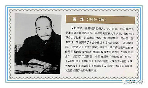 注:雷烽(1919-1986) 又名昌宗,陜西省合陽(yáng)縣城關(guān)西街人,中共黨員。1948年畢業(yè)于上海復(fù)旦大學(xué)西語(yǔ)系,同年冬到延安大學(xué)學(xué)習(xí),曾任西北革命大學(xué)助數(shù),韓城象山中學(xué),合陽(yáng)中學(xué)教師。離休后,著書立說,先后完成了《合中史話》《教育美學(xué)》《邏輯學(xué)進(jìn)話》《雙游記》《燈下漫筆》等著作。晚年將自己畢生省吃儉用積蓄的壹萬(wàn)元捐給合陽(yáng)縣教育委員會(huì)作為“勸學(xué)獎(jiǎng)基金”,受到了廣泛贊譽(yù),省政府授予“勞動(dòng)極范”稱號(hào)?!度嗣袢?qǐng)?bào)》《教育報(bào)》《陜西日?qǐng)?bào)》《陜西工人報(bào)》《陜西農(nóng)民報(bào)》《渭南報(bào)》《合陽(yáng)報(bào)》及陜西電臺(tái)等多家新聞媒體宣傳報(bào)道了他的先進(jìn)事跡。