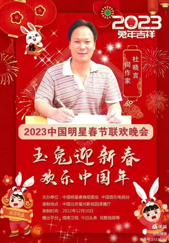 杜曉言,軍旅詞作家,騰訊音樂(lè)人,中國(guó)音樂(lè)著作權(quán)協(xié)會(huì)會(huì)員,傳略收入《鄆城名人大詞典》《詞曲中國(guó)藝術(shù)人才庫(kù)》等。1962年11月山東鄆城生人,現(xiàn)定居兗州。1981年10月參加鐵道兵,1984年1月隨鐵道兵集體兵轉(zhuǎn)工。迄今在央視、省市級(jí)電視臺(tái)演唱作詞歌曲20余首。在國(guó)家級(jí)和省部級(jí)刊物發(fā)表歌詞500余首。多首作詞歌曲在社會(huì)廣泛流傳,多首作詞歌曲改編葫蘆絲名曲,多首作詞歌曲參加大型文藝晚會(huì)并獲獎(jiǎng),多首作詞歌曲收入大學(xué)音樂(lè)教材,多首作詞歌曲入選影視劇主題歌曲,著有多部歌詞集。自學(xué)事跡曾在《人民日?qǐng)?bào)》《工人日?qǐng)?bào)》《百度新聞》等高端媒體報(bào)道。