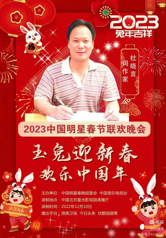 杜曉言(杜效言),軍旅詩詞、散文、小說作家,新聞撰稿人,騰訊音樂人,中國音樂著作權(quán)協(xié)會會員,中國職工音樂家協(xié)會會員,中國職工攝影家協(xié)會會員,鐵路工程建設(shè)網(wǎng)通訊員。傳略收入《鄆城名人大詞典》《詞曲中國藝術(shù)人才庫》等。1962年11月山東鄆城生人?,F(xiàn)定居濟(jì)寧市。1981年10月參加鐵道兵,1984年1月隨鐵道兵集體兵轉(zhuǎn)工。迄今在央視、省市級電視臺演唱作詞歌曲20余首。在省部級以上刊物發(fā)表歌詞500余首。多首作詞歌曲在社會廣泛流傳,獲改編并獲獎。著有多部歌詞集。