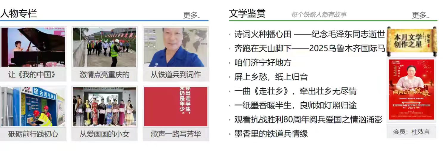 自那以后,我的腳步總追著鐵道的方向,我的筆墨總繞著建設(shè)者的模樣。揣著筆記本跑遍工地,聽鋼架上的工友講攻堅克難的過往,看夕陽把橋墩染成溫暖的橘黃,再在深夜的燈下,把這些帶著鋼軌溫度的瞬間,一字一句釀成文字。未曾想,我采寫的新聞人物專欄,會在網(wǎng)站占了那般重的分量,字里行間的鐵道精神,成了企業(yè)闖市場時最亮的光;更未曾想,閑暇時寫的詩詞散文,會屢屢摘下“本月文學(xué)之星”,那些藏在筆墨里的野花、月光,還有工友們黝黑的笑臉,都成了我與鐵道網(wǎng)最深情的對話。
