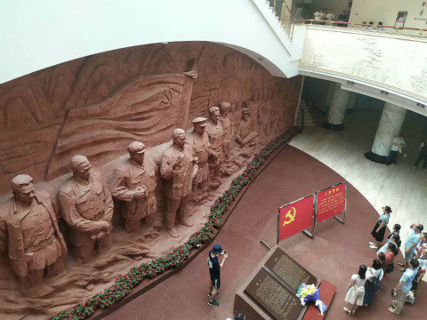 在雕塑的正后方便是百色起義紀(jì)念館,江澤民題寫(xiě)的“百色起義紀(jì)念館”七個(gè)行書(shū)鎦金大字熠熠生輝。四根粗大圓柱穩(wěn)穩(wěn)地支撐著外廊,象征著百色人民頂天立地、砥柱中流。大門(mén)兩側(cè)分別雕刻著有“土地革命”和“武裝斗爭(zhēng)”的場(chǎng)面的白色浮雕。沿著開(kāi)滿鮮花的花壇一側(cè)拾階而上,懷著崇敬的心情步入序幕廳。序幕廳正壁是“百色起義”漢白玉大型浮雕,以磅礴的氣勢(shì),再現(xiàn)了鄧小平等老一輩無(wú)產(chǎn)階級(jí)革命家的光輝形象及當(dāng)年百色起義波瀾壯闊的場(chǎng)景。在大廳正壁的浮雕前,展館特意擺放了中國(guó)共產(chǎn)黨黨旗和入黨誓詞,便于前來(lái)參觀的黨員同志面對(duì)先烈、面對(duì)黨旗重溫誓詞,不忘初心,踐行使命。