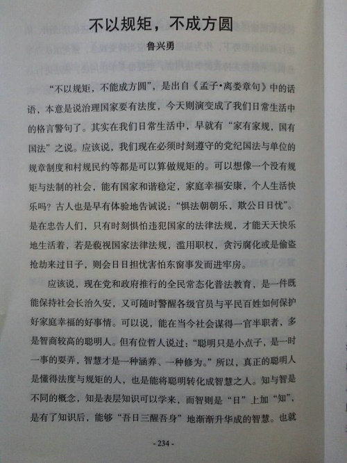 應(yīng)該說現(xiàn)在黨和政府推行的全民常態(tài)化普法教育,是一件既能保持社會(huì)長(zhǎng)治久安,又可隨時(shí)警醒各級(jí)官員與平民百姓如何保護(hù)好家庭幸福的好事情??梢哉f能在當(dāng)今社會(huì)謀得一官半職者,多是智商較高的聰明人。但有位哲人說過:“聰明只是小點(diǎn)子,是一時(shí)一事的耍弄,智慧才是一種涵養(yǎng)、一種修為。”所以真正的聰明人是懂得法度與規(guī)矩的人,也是能將聰明轉(zhuǎn)化成智慧之人。知與智是不同的概念,知是表層知識(shí)可以學(xué)來,而智則是“日”上加“知”,是有了知識(shí)后,能夠“吾日三醒吾身”地漸漸升華成的智慧。也就是說既要學(xué)法懂法,還會(huì)用所學(xué)的法律法規(guī)來約束自己才是。