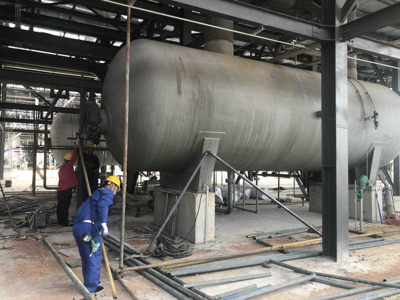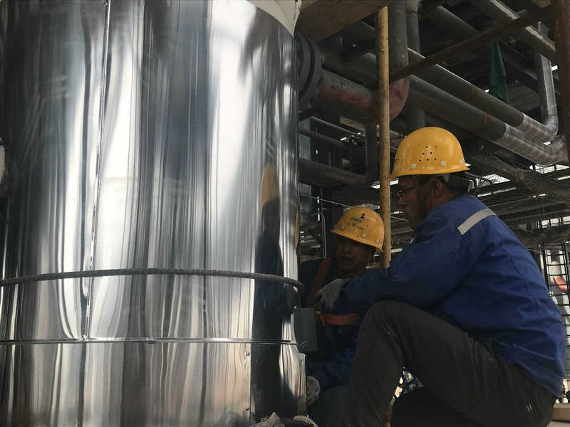 施工人員正在進(jìn)行脫碳器設(shè)備絕熱施工