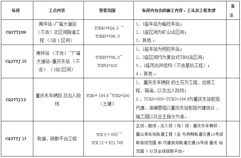 本招標(biāo)項目里程樁號為:YCK40+524.3~YCK51+102線路長度為10.58km(包括重慶東車輛段及出入段線,南坪站(含)~重慶東站(不含)的區(qū)間工程及車站工程等,對應(yīng)CQ27TJ09~CQ27TJ13等4個施工標(biāo)段。